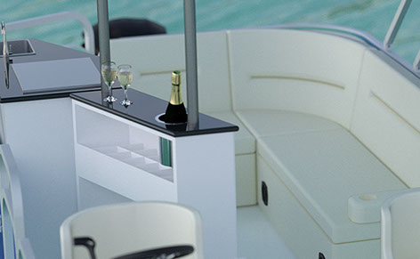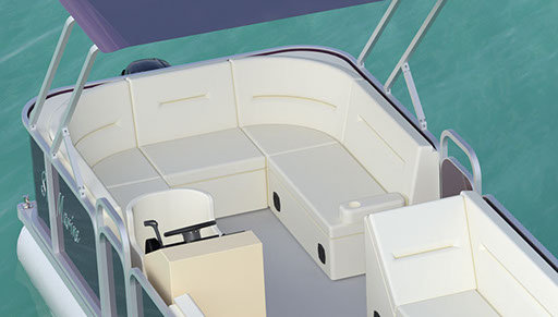 The seating and and lounge furniture is made from welded tubular aluminum frames, UV resistant marine grade vinyl. A quality stereo system can be incorporated into the furniture.